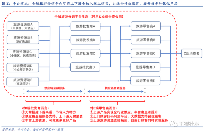 阿里飞猪+蚂蚁金服有望在旅游和支付两大体系为合资公司提供支持,众信提供资深旅行社上下游资源,全域旅游分销平台未来潜力可期。①本次众信与阿里在股权、合资公司、资源等多领域深度合作,我们认为有望深度绑定阿里在旅游行业发展“新零售”模式。根据公告,本次战略合作内容包括了:1)产品供给:众信将给予阿里旅行包括但不限于平台分销、采购价格、结算、优先供应、独家代理等各方面政策的支持;2)渠道和品牌:双方同意探索和推进“旅游线下新零售”商业模式,在渠道端探讨品牌联合及规划,在部分地区尝试开设试点门店;3)大数据技术:利用双方资源优势,结合大数据技术,持续提供更多更具价值的创新产品;4)支付:阿里旅行将为公司在支付系统方面提供方案支持,有助于提高公司线上支付水平及资金使用效率;5)系统:阿里旅行将为公司在内控管理、销售及采购支付、资金结算等方面,提供系统解决方案的支持。此外,双方为更好实施战略合作,共同出资设立合资公司,并引入阿里网络成为公司战略股东。阿里体系内飞猪旅行为国内OTA领域巨头之一,拥有丰富的旅行社零售端资源;蚂蚁金融在信用担保和金融支付方面可提升行业整体资金效率;以及众信作为国内出境游批发龙头拥有丰富上游目的地资源及下游旅行社零售渠道,本次多方资源联手布局旅游产品全域分销平台,我们认为或有望再造一个旅游行业的“1688”网站,为旅行社上下游的行业在效率上实现进一步提升,同时也有望为阿里和众信打开业绩增长新驱动力。对此,本篇报告将在章节一从“平台意义?”、“竞争优势?”、“产业格局?”、“盈利空间?”五个方面展开详细论述。