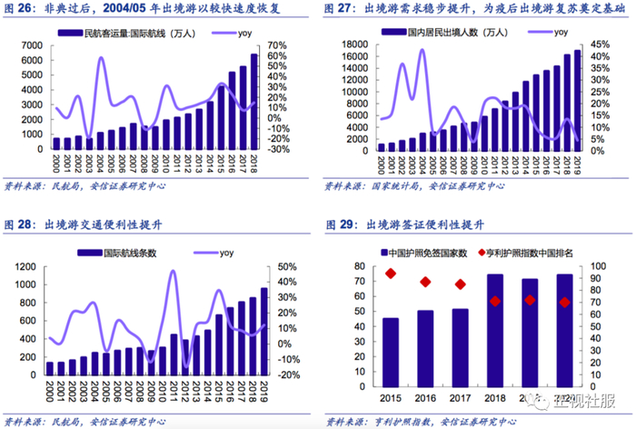 疫情前国内出境游需求已连续多年增长,有望为疫情后续的出境游复苏奠定客群基础。2015年以来虽国内出境游人次的增速有所放缓,但整体出境游需求仍保持增长态势,且市场规模持续大,2019年中国居民出境人数已达1.69亿。同时,根据亨利护照指数,我国护照从2017年的85名提升至2020年7月的71名,是免签落地签增加数量最快的国家之一;国际航线也由2015年的660条提升至2019年的953条伴。随着签证、交通的便利性提升,国内的出境游需求预计将继续保持稳步提升。