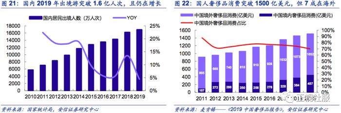 3)国内奢侈品消费约7成在境外,“一带一路”沿线免税市场空间大。①出境游人数持续增多:根据携程和银联国际联合发布《新旅游、新消费、新中产:2019年中国人出境旅游消费报告》显示,2019年中国人出境旅游消费依然世界第一,且中国出境游人群的海外消费倾向远高于其他国家的出境游人群。据联合国世界旅游组织的数据显示,2017年中国出境游人群的消费总额为2580亿美元,居全球第一(21%);国人出境游的平均消费支出为1,985美元,是英国(890美元)的两倍多。②国人境外免税消费仍占7成:2018年访问韩国国内免税店的中国消费者达到1293万人次,占访问韩国免税店总人数的26.9%。而中国人去年在韩国免税店消费约合834亿元人民币,占韩国免税店总销售额的73.4%。从全球数据来看,2019年中国人在全球奢侈品消费共计1509亿美元,但其中1052亿美元(占比约70%)奢侈品消费产生在境外;对应国内免税消费回流及一带一路沿线等国家和地区的免税市场布局具备较大市场空间。