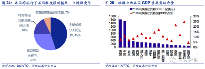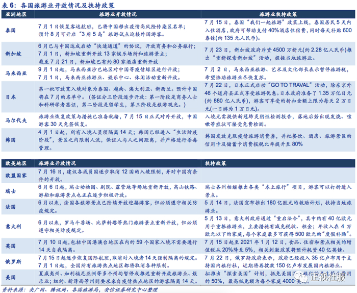 新冠疫情下2020年出境游市场短期受到显著冲击,政策层面今年6月起陆续已有国家和地区对国外游客重新恢复接待。疫情发生以来,许多国家采取了旅行限制和关闭机场、边境等措施。根据UNWTO的报告,全球217个国家或地区实行了不同程度的限制措施。其中,97个(45%)全部或部分关闭边界,有65个(30%)全部或部分停飞,有39个(18%)针对特定的目的地实施了边境关闭,剩下16个(7%)宣布实施游客检疫等措施。随着全球疫情逐步得到控制,各国缓慢解禁。全球第一个正式宣布将恢复旅游业的国家格鲁吉亚就将自6月15日起恢复境内旅游,自7月1日起重新对国外游客开放。