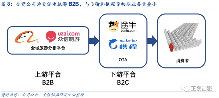 从旅游行业的产业链来看,全域旅游分销平台定位更多在B2B,为携程、飞猪等OTA的B2C上游供应商,竞争关系小。现有的OTA(飞猪、携程等)均以B2C的旅游产品销售为主,于合资公司定位的B2B平台并不重叠,为其下游商家。而对于众信而言,公司定位旅游批发业务,在本次的平台中可将自身产品纳入销售,为下游的零售客户渠道进一步打开,并结合飞猪将零售商或实施引流,对众信的主业在后续或不排除同样有望带来协同促进作用。