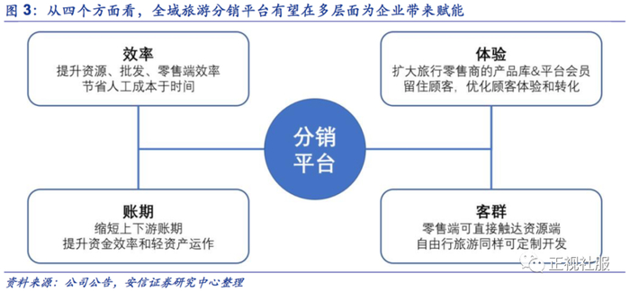 效率、体验、账期、客群四方面看,全域旅游分销平台有望帮助旅游业内B端企业更高效经营,践行阿里的“让天下没有难做的生意”企业使命。本次阿里与众信成立的合资公司,且阿里旅游持股55%,凸显出对本次合资公司未来发展的重视;考虑到后续合资公司的支付系统已公告披露将与蚂蚁金服的深度合作,未来或不排除两家公司在业务上实现更多互助支持。对于现有的旅游行业生态而言,新成立的全域旅游平台计划将旅游行业内的上游资源端(酒店、景区、机票等)和批发端(e.g.众信旅游等企业),与产业链中游的旅行社零售端实现打通;相比目前现有以线下为主的商谈业务模式,全域旅游分销平台可对进入该平台内的B端企业四个方面带来效率提升: