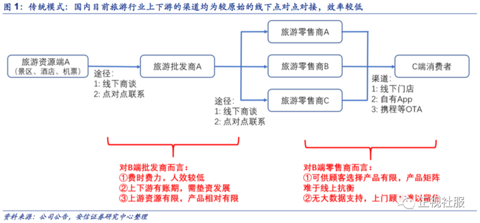 1)提升资源、批发、零售端效率,节省人工成本与时间:相比旅游B2C的零售端而言,受OTA(携程、飞猪、去哪儿等)发展较早,线上化率在行业内处于较高水平,但部分客单价较高的旅游产品仍需线下门店客服实现对接购买,而该环节上游的B2B端线上化率较低,大多仍采用原始的点对点对接为主,耗费大量的时间与成本,且不利于中小旅游零售商的发展。以国内一个北方的旅游批发商想做南方游客生意为例,在北方某景区的旅游产业设计完成后,该批发商需前往南方多个重点省份的当地旅游零售商进行渠道铺开与对接,中间涉及差旅、应酬和逐一讲解,效率相对较低且花费时间多;而全域旅游分销平台若搭建后,全国数量众多的各省份旅游批发商和零售商均在平台内,仅需线上选中南方重点省份的零售商,即可实现线上产品对接和讲解,节省成本与时间;且可以省出更多精力让批发商做更好的旅游产品,优化整体团队游品质和口碑。