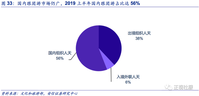 国内跟团游在出游人次上占比56%,仍为游客的主流模式。根据文化和旅游部发布的2019年上半年全国旅行社统计调查情况显示,按照入境外联人次、国内组织人次、出境组织人次三项指标,入境旅游、国内旅游、出境旅游市场人次所占份额依次为6%、79%和15%;按照入境外联人天、国内组织人天、出境组织人天三项指标,入境旅游、国内旅游、出境旅游市场人天所占份额依次为6%、56%、38%。(由于国内游相较境外游出游时间更短,因此按照人天计算,国内游份额占比有所降低)。
