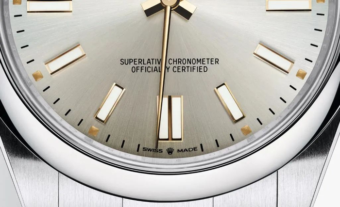 新一代蚝式恒动型为了标榜机芯升级,在腕表的6点钟时标下,“SWISSMADE”中间加入了一个皇冠标,以示区别。