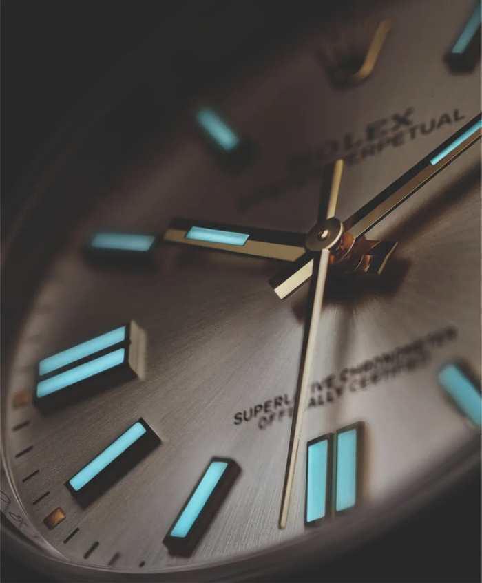 新一代蚝式恒动型还配备Chromalight 夜光显示:指针及钟点标记上涂有夜光物料,黑暗中散发持久蓝色光芒。