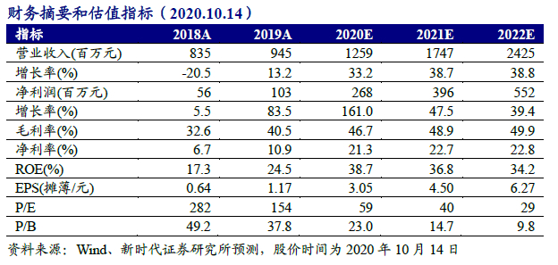 首次覆盖给予“推荐”评级。预计公司2020-2022年营业收入分别为12.59、17.47、24.25亿元,同比分别增长33.2%、38.7%、38.8%,归母净利润2.68、3.96、5.52亿元,同比增长161.0%、47.5%、39.4%,对应EPS分别为3.05、4.50、6.27。公司2021年PE估值50~55倍,对应股价225.0~247.5元。首次覆盖给予“推荐”评级。