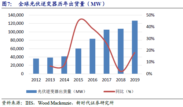 受益于新增光伏装机量增长,逆变器出货量稳步提升。全球光伏市场自2012年以来,在各国政府的激励措施和市场刺激计划极大促进之下得到了蓬勃发展,光伏逆变器出货量除2018年增速放缓之外,基本处于高速增长状态。根据IHS Markit发布的《2019 PV Inverter Market Tracker》数据显示,2012年至2019年全球光伏逆变器出货量由36.3GW增长至126.7GW,复合增速CAGR达到19.6%。