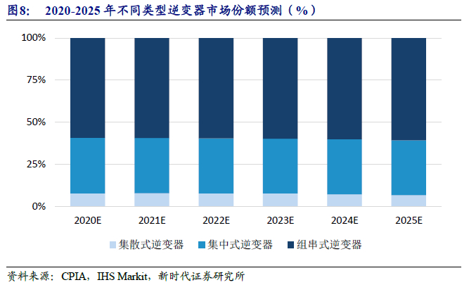 2.3、 行业结构变化:受益于分布式蓬勃发展及单机功率大型化趋势,组串式逆变器市占将进一步提升
