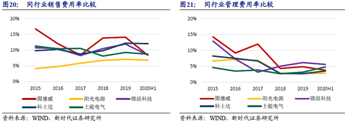 成本控制能力卓越,毛利率稳中有升。受行业技术进步及原材料成本下降等因素影响,光伏逆变器领域产品市场价格整体呈下降趋势。公司2015-2020H1综合毛利率存在一定波动且处于同行业较高水平,其中2019年较2018年主营业务毛利率上升7.89%,主要由于2018年底公司积极面向海外销售,境外产品平均销售单价相对较高,导致光伏并网逆变器和光伏储能逆变器产品毛利率上升。