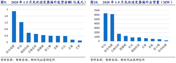 中国厂商发力布局海外业务,出口占比提升。2020年1-5月,光伏逆变器中国出口总出货量达到24.2GW,与去年同期相比环比增长35.5%。增长主要源于对欧盟、澳大利亚、美国、印度等地区出口大幅增长,特别是巴西市场出口增长迅速。发货金额方面,2020年1-5月阳光电源总发货金额1.89亿美元(包含印度工厂),排名第一,华为1.23亿美元,排名第二,锦浪0.58亿美元,排名第三。