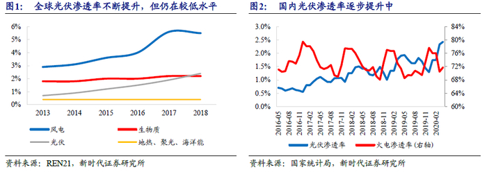 光伏发电渗透率仍在低位,长期成长空间广阔。光伏发电具备清洁性、可再生性、分布式等多重优点,当前已经具备较好的经济性,且成本还在不断降低,是理想的未来社会能源。尽管近年来光伏渗透率在不断提升,但整体仍处在较低水平,2018年全球光伏发电占用电量的比重仅2.4%(REN21数据),2019年国内光伏发电占比近1.6%。长期来看,光伏发展空间十分广阔。