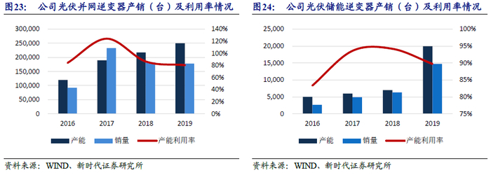 储能逆变器产销两旺,并网逆变器销量略有下滑。并网逆变器2017-2019年公司分别实现光伏并网逆变器产量23.6万台、18.8万台和20.1万台,分别实现储能逆变器产量5616台、6595台和1.8万台。2017年国内光伏装机量迎来爆发式增长,公司采用外代工的方式满足订单需求;2018公司迎合市场需求积极进行了扩产。未来,随着公司业务的持续发展,公司产销量将进一步提升。