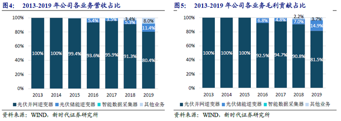多品类业务拓展,协同效应凸显。公司聚焦光伏并网逆变器细分赛道,同时布局储能逆变器业务,产品技术同源,技术优势共享,充分发挥原材料集中采购优势等协同效应。2019年公司光伏并网逆变器、光伏储能逆变器和智能数据采集器,三种产品占营收比例分别为80.4%、11.4%、0.1%。