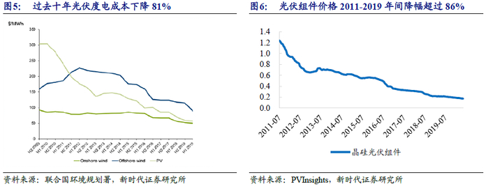 光伏成本不断下降,全球范围内平价上网催生增长动力。技术进步与产业发展成熟推动光伏成本持续下降,光伏不再是昂贵的能源,而是在全球越来越多的国家和地区成为成本最低的能源。光伏系统中占比最高的组件,其价格从2011年1.24美元/W降至0.17美元/W,降幅超过86%。过去十年,光伏度电成本(LCOE)由2009年304美元/MWh下降至2019年的57美元/MWh,降幅高达81%,远超其他类型的能源。光伏成本下降的动力仍在持续,全球范围内的平价上网正在逐渐实现,成长动力十足。