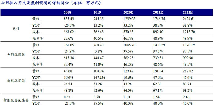 1)并网逆变器业务:考虑到十四五规划新能源在电力结构中占比提升、2060年前争取实现碳中和目标以及光伏逆变器替换需求的逐步释放,预计2020-2022年出货量将迎来大幅增长。假设公司并网逆变器销量2020/2021/2022年分别达到3.18/4.47/6.64GW;假设逆变器平均价格逐年下降,2020/2021/2022年平均单瓦价格分别为0.329/0.322/0.298元/W, 预计公司2020/2021/2022年并网逆变器业务营收分别10.46/ 14.38 /19.78亿元。