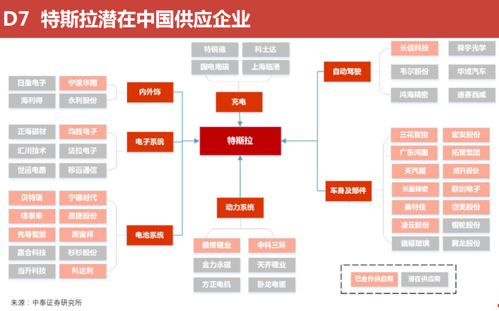 平安证券表示,随着特斯拉国产化进一步加深,更多的国产零部件企业有望实现对特斯拉的供货。潜在供应商主要分为两类:1)与特斯拉洽谈并取得合作意向的企业;2)目前国产化程度较低的零部件中比较优秀的国内龙头企业,主要涉及车灯、轮胎、启动电池、电机电控、充电桩等环节。国产优质供应商将受益于特斯拉国产化的持续推进。
