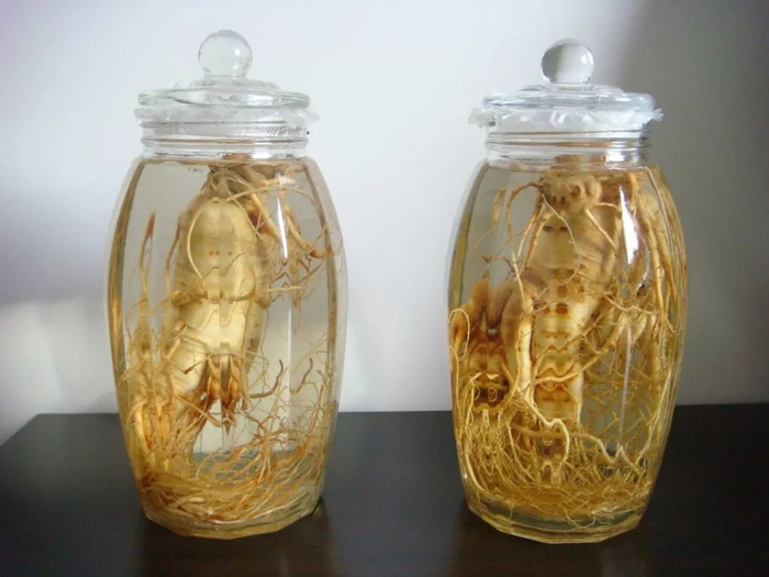将鲜人参洗净后,整棵放入酒瓶,用50~60度白酒浸泡1月以上。每日小酌一杯,大补元气,延年益寿。