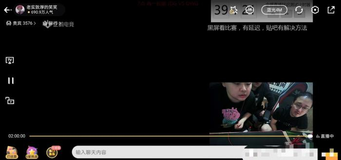 以德云色直播间为例,在比赛进行时,直播间画面主体为黑屏,右上角为一个计时器,与比赛时间同步。在计时器下方有一行白字:“黑屏看比赛,有延迟,贴吧有解决办法。”