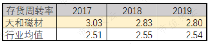 存货运营效率方面,天和磁材的钕铁硼毛坯生产周期较成品短、毛坯销售金额曾占主营业务收入的四~六成,两相结合拉高了公司的存货周转率,高于行业均值。