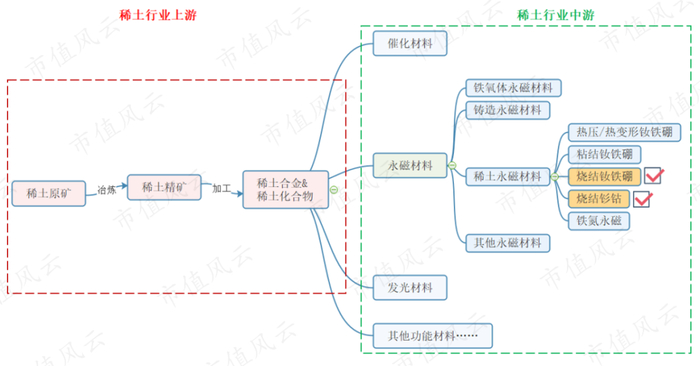 经冶炼、加工后,稀土原矿可被制成稀土化合物和稀土合金,继而被分离成永磁材料、催化材料、发光材料等多种功能材料,最终应用在汽车、风力发电、家电、无线通信等多个下游领域。