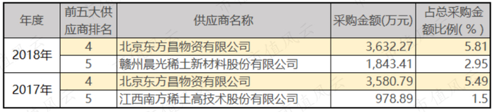 而2017年~2019年天和磁材依次向东方昌物资采购了3,580.79万元、3,632.27万元和2,469.83万元的原材料,采购额占比分别为5.49%、5.81%和3.59%。