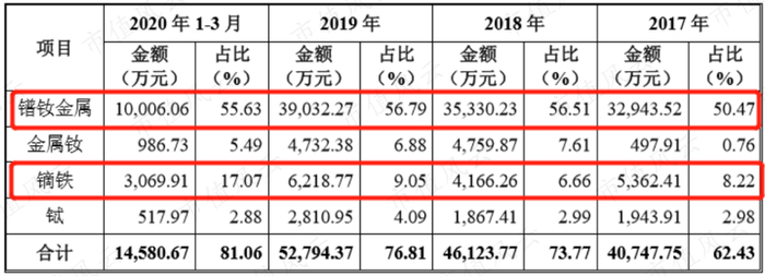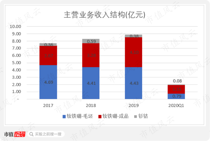2017年~2020年一季度,天和磁材的钕铁硼在主营业务中占比超九成,其中过半为钕铁硼毛坯产品。