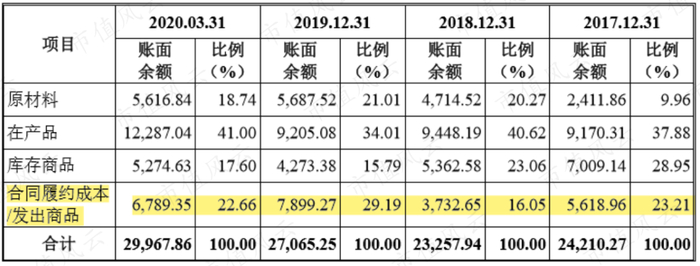 2017年~2020年3月,天和磁材的存货在总资产中的比重分别为25.79%、25.10%、25.18%和28.43%。占存货16%~29%的,是发出商品(后改为合同履约成本)。