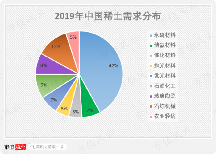 近年来,风电、新能源汽车、节能家电的快速发展带动了终端市场对永磁材料的需求。2019年我国最大的稀土行业需求来自永磁材料,占总需求比重为42%。