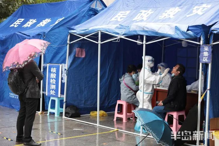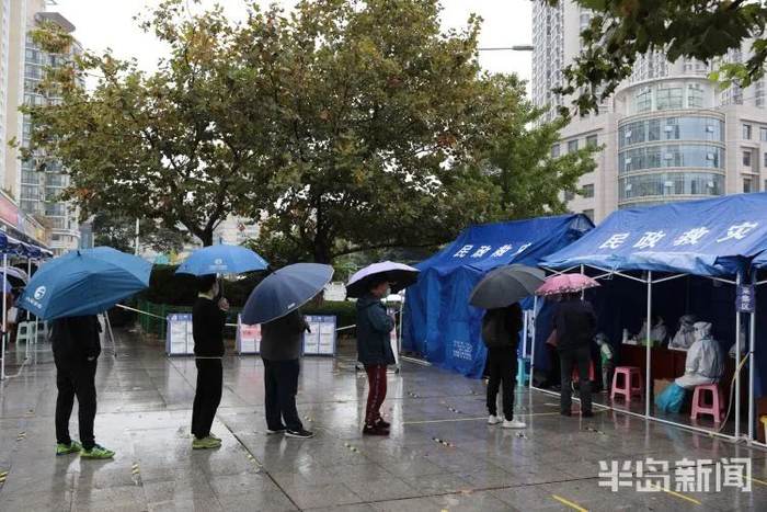 10月14日上午,天空飘起小雨,崂山区仙霞岭路惠都社区居民核酸检测点,市民正在排队检测。