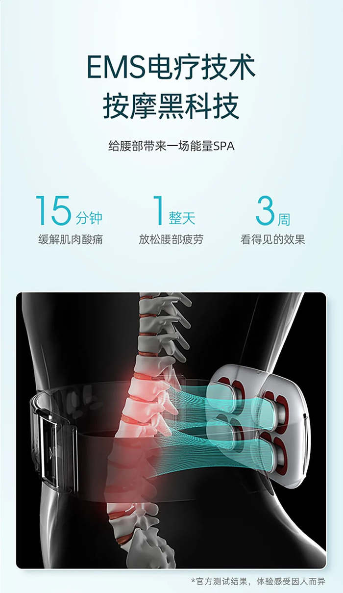 1、EMS电脉冲放松腰部肌肉,红光+热敷促进血液循环,腰部更舒适~