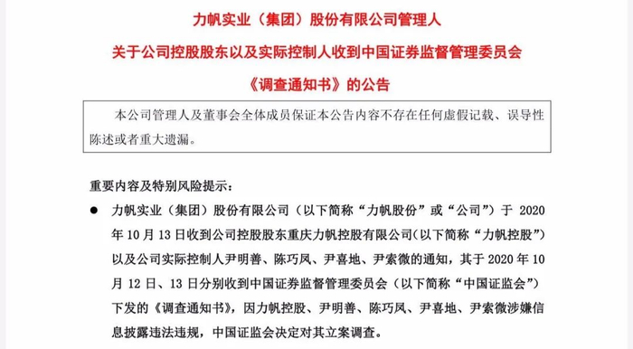 2020年10月13日晚间,*ST力帆(601777.SH,以下亦称力帆股份)发布公告称,2020年10月13日收到公司控股股东重庆力帆控股有限公司(以下简称“力帆控股”)以及公司实际控制人尹明善、陈巧凤、尹喜地、尹索微的通知,其于2020年10月12日、13日分别收到中国证券监督管理委员会(以下简称“中国证监会”)下发的《调查通知书》,因力帆控股、尹明善、陈巧凤、尹喜地、尹索微涉嫌信息披露违法违规,中国证监会决定对其立案调查。