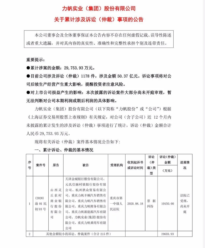 《商学院》记者整理发现,力帆实业曾于8月24日发布《关于累计涉及诉讼(仲裁)事项的公告》。公告显示,目前公司涉及诉讼(仲裁)1178件,涉及金额50.37亿元。对公司(含子公司)近 12个月内未披露的累计发生的涉及诉讼(仲裁)事项进行了统计,诉讼(仲裁)金额合计人民币约2.98亿元。