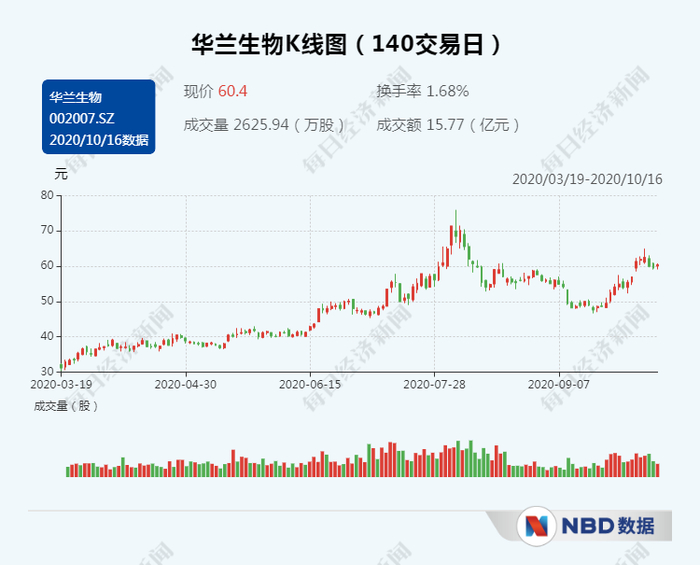 不过,华兰生物没有单独披露流感疫苗的收入情况,子公司华兰生物疫苗股份有限公司2019年收入为10.49亿元,同比增长30.68%,净利润3.75亿元,同比增长38.92%。2020年上半年,其疫苗业务收入为-579万元,同比下滑148.37%。二级市场上,华兰生物因流感疫苗概念近期备受关注,10月13日盘中最高触及65元/股。