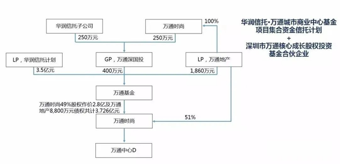 华润信托子公司与万通时尚成立“万通深国投”(400万元)作为GP,华润信托计划(3.5亿元)和万通地产(1,860万元)作为LP设立万通基金。