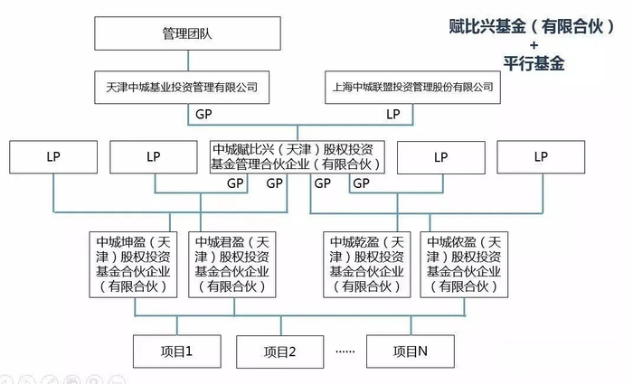 “赋比兴基金”作为GP与募集而来的各LP分别成立“中城乾盈基金”、“中城坤盈基金”、“中城君盈基金”和“中城侬盈基金”等平行基金。