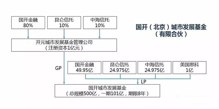 开元城市发展基金为GP,国开金融以自有资金与昆仑信托和中海信托作为LP,以信托资金出资基金。