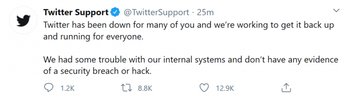 Twitter的官方状态页面也被更新以反映这一事件,另外它还特别指出:“我们没有证据表明这次中断是由安全漏洞或黑客造成的。我们目前正在调查内部原因并将很快会公布更多。”