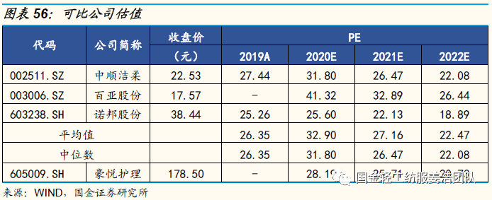 3、成人失禁用品:当前行业尚处于市场导入期,行业竞争者以价格战为主要战略,公司下游客户订单稳定,我们预计2020-2022年公司成人失禁用品营收同比+16.7%/23.6%/19.3%,预计毛利率为35%/34%/34%。