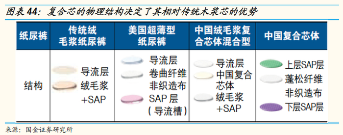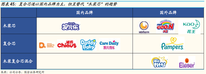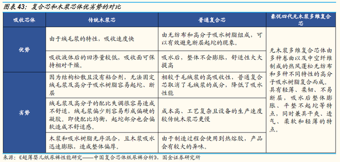 以纸尿裤的关键吸收性材料复合芯为例,当前纸尿裤的吸收芯体按照物理结构不同可分为传统木浆芯、普通复合芯。过去复合芯主要集中于国产品牌凯儿得乐、爸爸的选择等,近年来复合芯体凭借轻薄、干燥、舒适的优势逐渐取代传统木浆芯,实现技术路线的“赶超”,国际大牌逐渐重视复合芯体工艺建设。豪悦提前布局复合芯体技术,并且在普通复合芯技术基础上进一步进行技术改善创新,凭借技术先发优势以及完善的配套供应链体系,逐渐获得宝洁等国际大客户订单。