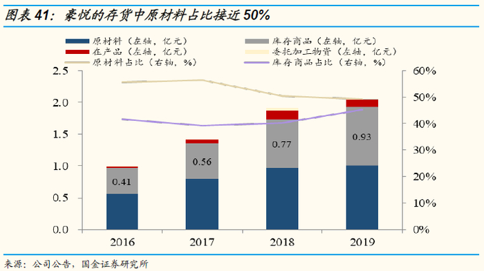 得益于供应链端的快响应模式,下游传统制造型品牌企业存货周转天数在3-4个月,而豪悦存货周转天数维持在50-80天,且存货中为原材料占比平均在50%以上。