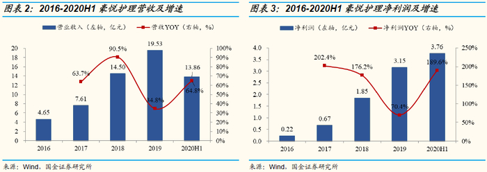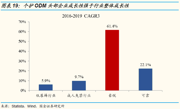 豪悦护理2008年在杭州成立,专注于妇、幼、成人吸收性卫生用品的研发、制造与销售。公司业务以婴儿纸尿裤ODM加工业务为基本盘,涵盖女性卫生用品、成人失禁用品全生命周期品类,兼具发展自有品牌业务。2017-2019年公司营收由7.6亿元增长至19.53亿元,复合增速达60.2%,净利润由0.67亿元增长至3.15亿元,复合增速达117%。