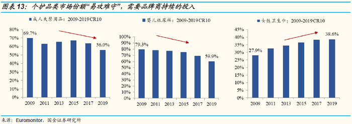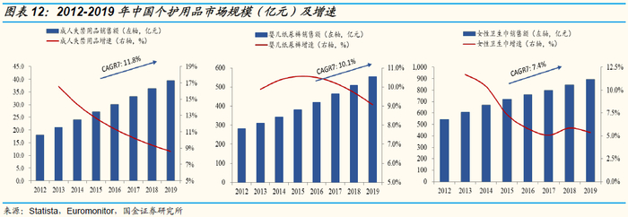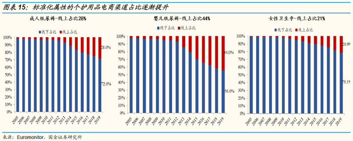 中国个护行业成长红利仍持续,但品牌格局持续分化。中国婴儿纸尿裤、成人纸尿裤过去年复合增速超10%,未来仍将享受渗透率提升+消费升级的双重红利。复盘行业竞争格局变化,我们看到行业正在经历由外资品牌主导→微商&电商新锐品牌爆发的格局演变,行业格局呈分化式发展。这背后的原因主要有两点:1)行业本身具有高标准化与快速消费属性;2)渠道场景分化趋势下为国产新兴品牌的崛起提供成长空间。