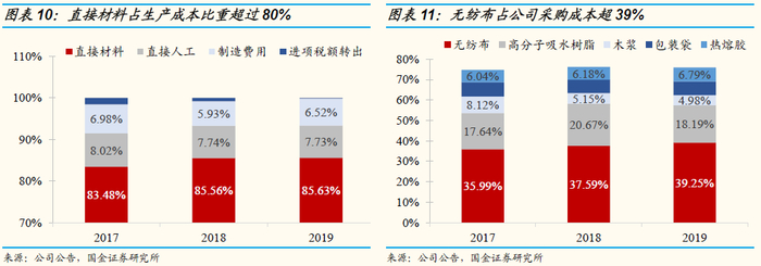公司营业成本集中于直接材料,直接材料占总生产成本的比例超过80%,其中,无纺布占据了公司采购成本的大头,2019年,无纺布占公司采购成本超过39%,原材料价格波动对生产成本造成一定影响。