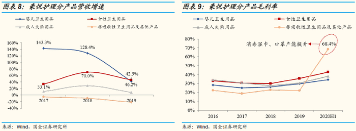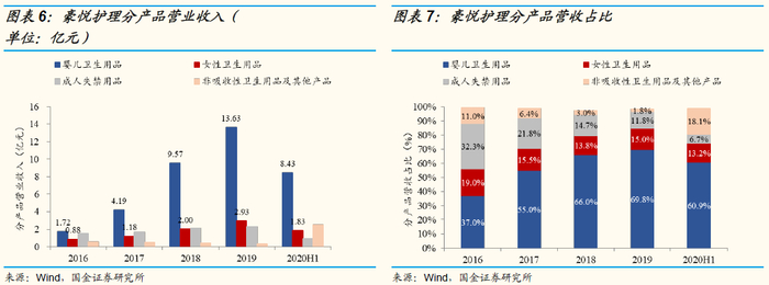 婴儿卫生用品:受益品类渗透+下游品牌快速成长,处于高速成长期。婴儿卫生用品以婴儿纸尿裤产品为主,受益于品类渗透与下游新兴渠道品牌的快速发展,2016-2019年婴儿卫生用品营收复合增速达99.3%。2017-2020H1年婴儿卫生用品营收分别为4.19/9.57/13.63/8.43亿元,营收占比分别为55.0%/66.0%/69.8%/60.9%。