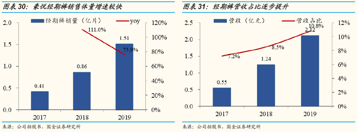 公司凭借在经期裤的制造先发与工艺先发优势,产品研发较为成熟,当前已与宝洁(护舒宝)、尤妮佳(苏菲)等国际大品牌展开合作,经期裤销售量由2017年的0.41亿片增长至2019年的1.51亿片,复合增长率达91.9%,经期裤营收由0.55亿元增长至2.12亿元,复合增速96.3%。我们判断,伴随下游客户对经期裤的推广力度加快,公司在中短期有望享受细分赛道成长红利。