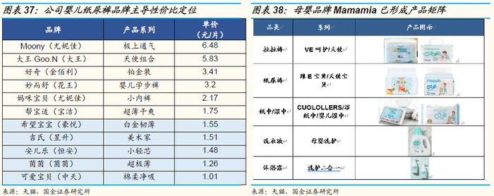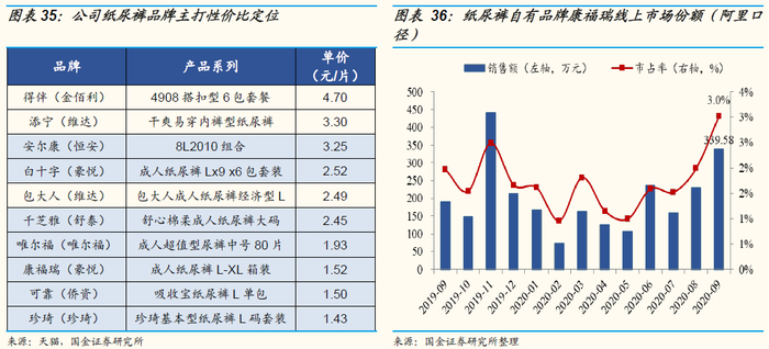“高性价比”策略切入大众长尾市场,以点带面产品矩阵逐步健全。公司的成人纸尿裤和婴儿纸尿裤自有品牌主打性价比策略。其中,“康福瑞”成人纸尿裤热销产品单价为1.77元,凭借高性价比市场份额不断抬升。公司旗下自有母婴品牌Mamamia采取“电商+新零售”相结合的模式,以纸尿裤为基本盘,向纸巾、洗护品类延展,产品矩阵不断完善。