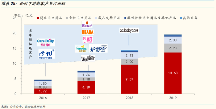 1)原有客户成长:主要借助下游客户的成长,以及合作品类范围的扩大。以凯儿得乐为例,当前为公司第一大客户,自2017年借助新兴渠道快速发展。2018年,公司来自凯儿得乐的营收同比+80.9%,2019年订单略有下滑。品类方面,公司与大多数个护品牌客户合作范围超过两个品类,比如与宝洁的合作有经期裤和婴儿纸尿裤两个品类。