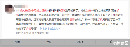 近日,一则关于江西电信拟向征信中心报送手机用户恶意欠费信息的新闻引发公众热议,电信信息上征信的必要性和对个人信用的评估价值成为讨论焦点。北京商报记者10月15日查询发现,关于“手机欠费上征信”的微博话题阅读次数高达7.5亿,讨论量也达到3.6万条。