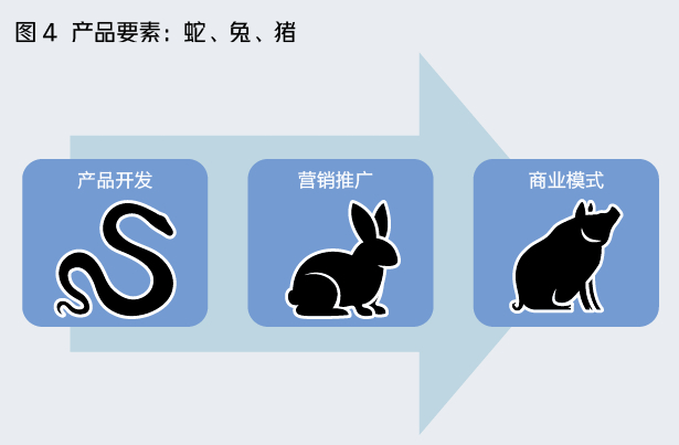 产品要素的第二个要点是营销推广。与“将军赶路,不追小兔”的战略管理不同,营销是个细致活,需要基于对用户的深刻洞察采用相应的营销和推广行动。因此,可以选用“兔”来比喻营销推广。和老鼠类似,兔子也具有很强的繁殖能力,这意味着营销推广需要利用口碑营销、广告营销和关联营销等方式与用户需求匹配,最大化企业产品和用户需求的匹配度。同时,由于用户需求多样且变化很快,渠道也需要做到快速变化,以确保用户在有需求的情景下能够获得本企业的产品和服务。